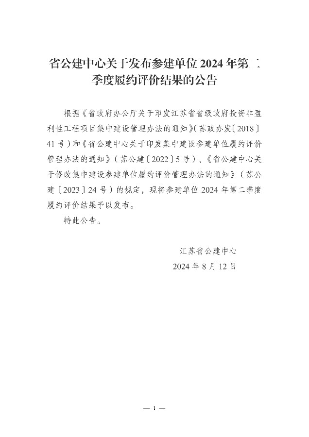 省公建中心關(guān)于發(fā)布參建單位2024年第二季度履約評價(jià)結(jié)果的公告